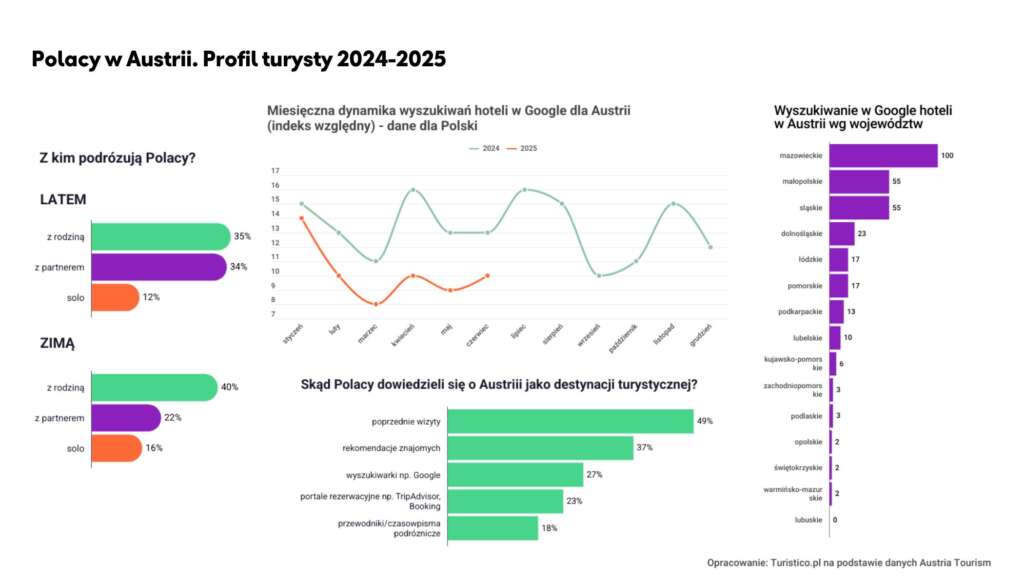Dane z zimowych miesięcy pokazują skalę tego zainteresowania – w styczniu 2025 liczba noclegów Polaków w Austrii przekroczyła pół miliona, a w lutym utrzymała się na zbliżonym poziomie do rekordowego sezonu 2023/24. Wśród regionów alpejskich niezmiennie dominują Tyrol i Salzburg, jednak to Karyntia zyskuje na dynamice – przyciągając coraz więcej rodzin i osób poszukujących spokojniejszej, bardziej kameralnej alternatywy dla popularnych ośrodków. To właśnie zimą Austria przyciąga nie tylko doświadczeniem i infrastrukturą, lecz także emocjami, które od lat budują wizerunek kraju jako najbardziej autentycznego centrum narciarskiego Europy. Polacy odwiedzają austriackie kurorty głównie w rodzinnym gronie (40%) lub z partnerem (22%), a aż dwie trzecie z nich to stali bywalcy, wracający co roku w te same doliny i ośrodki. Analiza turistico.pl potwierdza, że siłą tego rynku jest lojalność – aż 49% respondentów poznało Austrię dzięki wcześniejszym pobytom, a kolejne 37% przyjechało z polecenia znajomych.